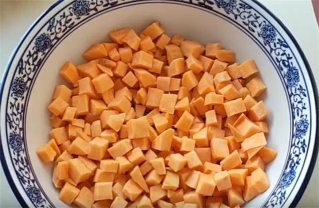 1.今天和大家分享一个红薯简单又好吃的做法,首先我们准备一根红薯洗净去皮,把它切成半厘米或者是1厘米左右的小丁,装入碗中。www.ws46.com