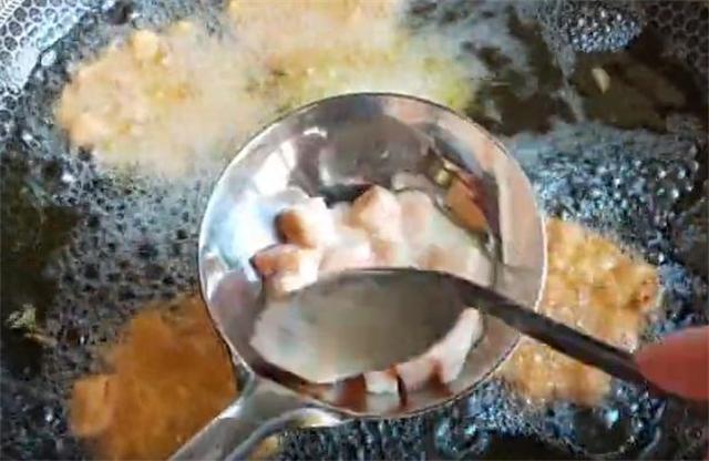 3.锅中稍微多放一些油,油温四成热先把勺子烫一下预热,然后放入地瓜块,用勺子把它整理成圆形的小饼,没入油中炸至从勺子脱落即可,反复重复这个动作。