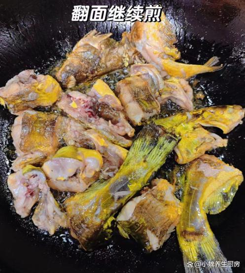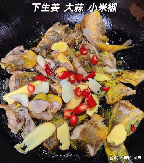 步骤5:锅底烧热乎,加上植物油少许,倒入腌制好的黄骨鱼,两面煎至定型,锅边淋入少许料酒去腥。