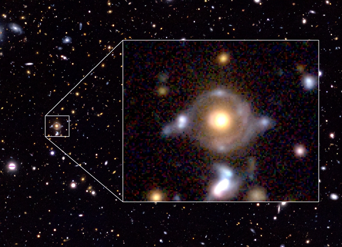 当它后面更远更古老的星系发出的光线通过相当于把一粒沙子放在指尖,然后伸直手臂,从肩膀处看过去,沙子与地球的比例就像这片星系与天空的比例。