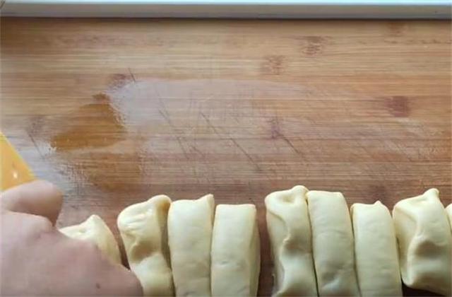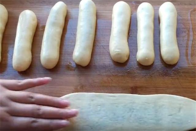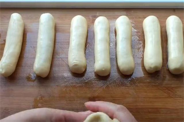 5.然后把发好的面揉搓排气,排去里面的气体,搓成长条,分成小面剂。