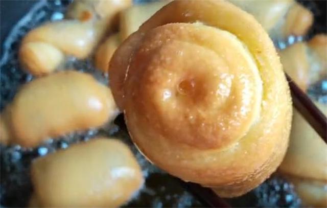 9.油温2到3成热下入生坯,油温千万不要过高,这样炸出的面包外皮会非常的干硬,而内部却不一定能熟透,全程小火慢炸,炸至表皮微黄飘起,像这种程度就可以出锅。