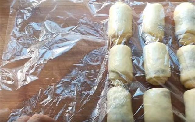 8.接下来把生坯盖上保鲜膜,二次醒发15到20分钟,醒发至拿起来轻飘飘,体积明显变大即可。