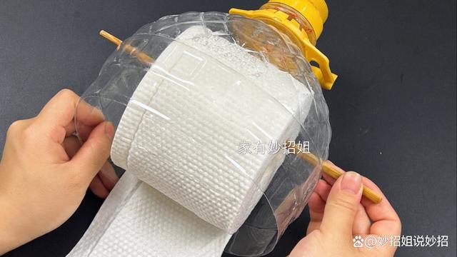 然后再拿一根筷子穿进洞中,在筷子的中间放上一卷纸巾,这样一个纸巾盒就完成了。