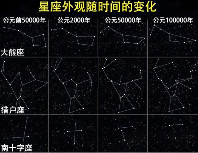 以北斗七星为例,科学家根据每颗星星的运动速度和方向,大致描绘出了它十万年前和十万年后的样子,和当下都完全是两个形状,十万年前的原始人和十万年后的未来人,和我们看到的北斗七星截然不同,也就是说,我们每天看到的星空都是不一样的。 |