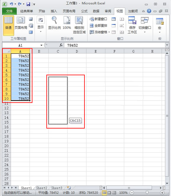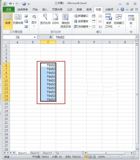 4、就这样我们把刚刚输入的一列数字拖动到C6∶C15了。