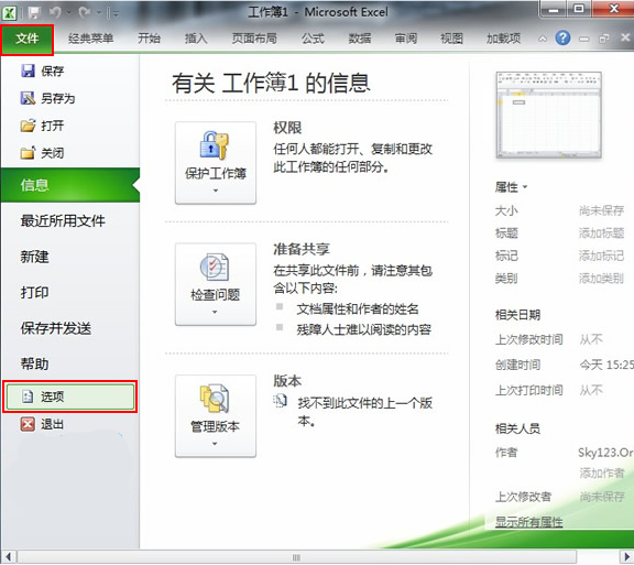 1、打开Excel2010,选择左上角的“文件”功能栏,然后点击“选项”功能。