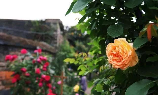 拱门的旁边是老旧的围墙,虽然没有经过维修处理,但是栽植在这里的红色龙沙宝石和这种老旧的围墙很配。把围墙修起来反而觉得多余了。