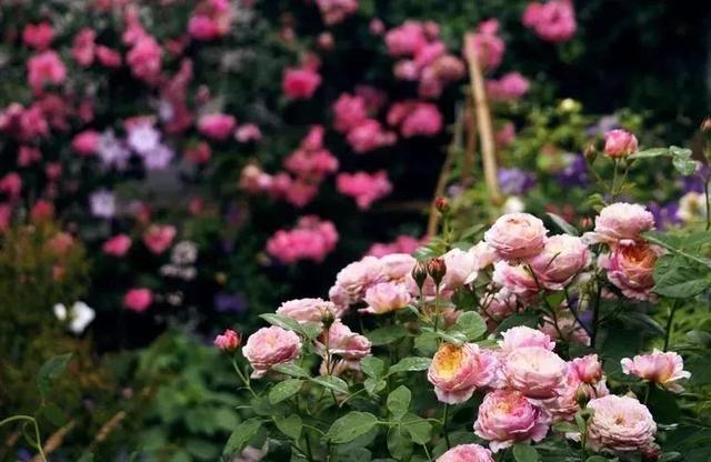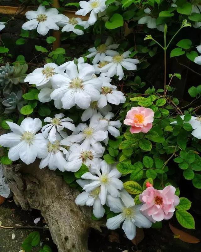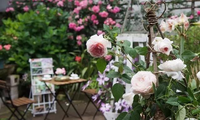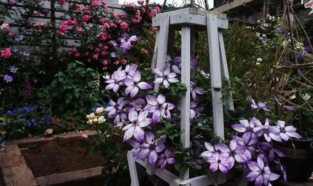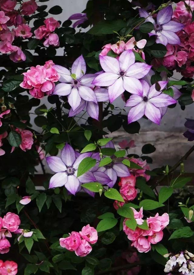 还有一种铁线莲美好的回忆,栽培在了一处木架子旁,以木架子为攀援目标,虽然还没有攀爬到位,但是和周围的月季已经相互纠缠在了一起,看上去却显得无比的协调。
