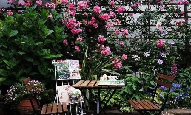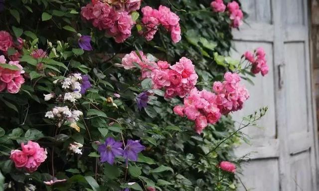 看到这里,这个小院里的一号主角,月季花是当之无愧的,但还有着二号主角还没出场,就是有着“藤本皇后”之称的铁线莲。女主选择的是F系列的铁线莲,生长是很快的,基本上,一年就能爬满一个墙面了。
