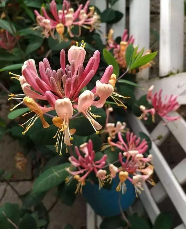 在围栏边上,还栽植了一些金银花,利用其能够攀爬的特性,把围栏也装饰得漂漂亮亮的。