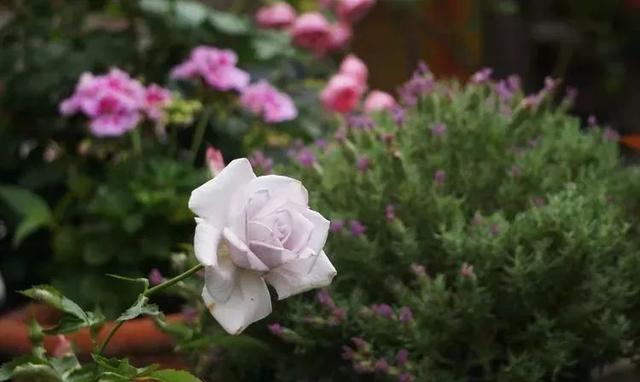 还有威基伍德玫瑰,虽然开花时,因为叶茎太软,花朵会垂头,但颜值是真的在线,每次走过这里,总是会停驻一会儿,细细地观赏。
