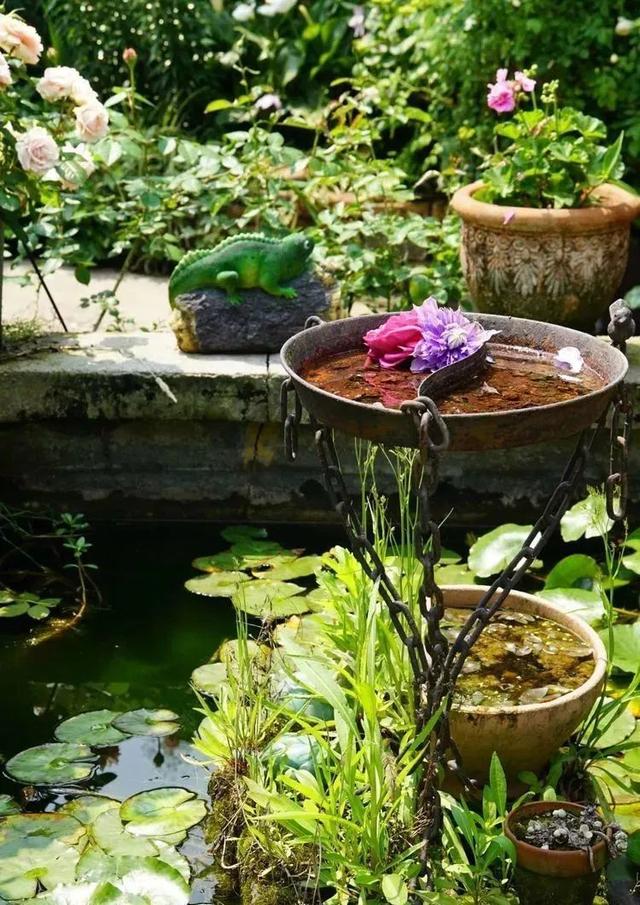这一处的鱼池,虽然收拾得不尽如人意的,但是并没有养鱼,而是栽植着几株莲花,周围还摆放着一些装饰物。按照女主的说法,这些东西原本都是小院里的,自己只是把它们简单地收拾了一下。