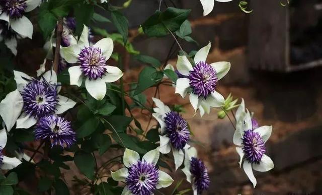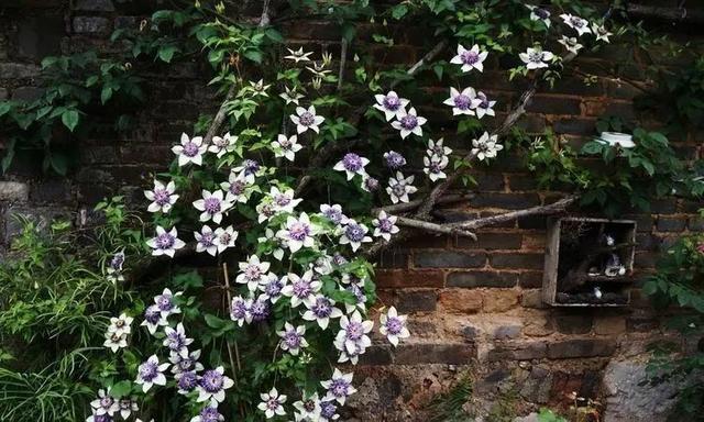 这是老幻紫,美丽淡雅的白紫色配色,真的和老墙非常的配,而作为牵引的尽然是随意找来的一截枯树枝,但看上去却显得无比的协调。