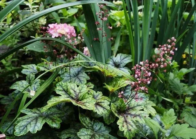 说到无尽夏,它新枝开花的特性,能让它反复开花,就这一点,在任何的小院里,无尽夏都是必备的品种之一。 红花需要绿叶衬,三个大主角肯定还是需要一些配角的,而被称为花园里的“调色板”的矾根似乎也是小院的必备绿植了,可观花颗观叶,一年四季尽不同,非常值得栽上一些。