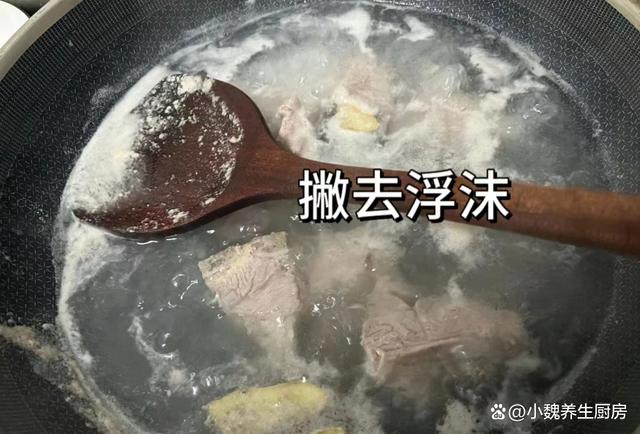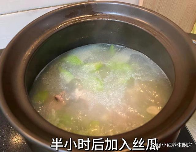步骤6:将排骨倒入砂锅里,加上两大碗开水,大火转小火煮半个小时,倒入一些丝瓜块,加上一小勺鸡精和一勺食盐,最后调入一小勺胡椒粉,有条件的家庭,可以丢入一些枸杞子,撒上葱花点缀即可,这款丝瓜排骨汤就可以开吃了。 丝瓜排骨汤是我们家每周必喝的靓汤之一,鲜美度不输鸡汤,选用丝瓜和排骨炖一锅,清甜解腻,营养易消化,预防上火,安稳度过春季。