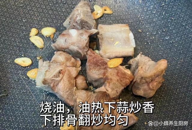 (www.wS46.com) 详细制作顺序: 步骤1:提前选购好丝瓜,排骨和其他食材,先把生姜去皮,切成若干片状,大蒜切碎成细末,香葱洗净切成若干小段,备用。步骤2:将两条丝瓜去掉瓜皮,切掉两头洗干净,切成若干滚刀块,丝瓜块很容易发黑氧化,丝瓜用盐水浸泡一会儿,最后捞出控干表面水分。 步骤3:提前把排骨剁成大小相同的块状,全部放在容器里,加上几勺面粉,反复用手揉搓,吸附掉一些黏液和脏东西,用流水冲洗干净,控干水分备用。 步骤4:准备好一个炖锅,锅中放入排骨和冷水,放入葱段,姜片和料酒几勺,把猪排骨焯烫去腥,逼出排骨的血腥物质,准备好丝瓜和焯水好的排骨,开始制作这款丝瓜排骨汤。 步骤5:锅底提前烧热后,加上食用油和姜蒜片,倒入排骨煎至两面金黄,加上少许料酒去腥,翻炒均匀。