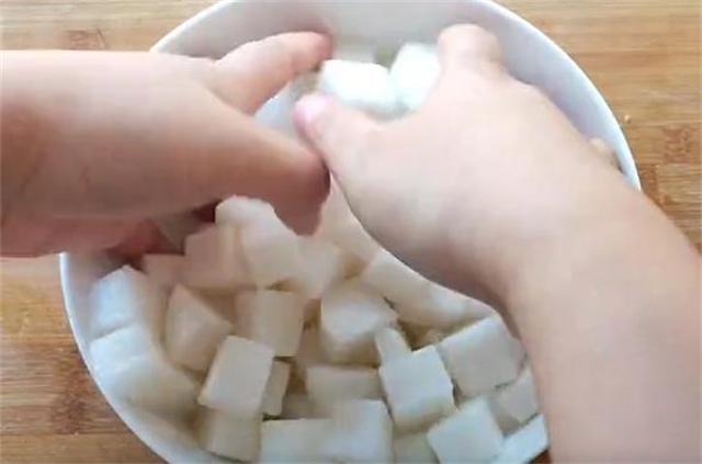 1.今天和大家分享一个朝鲜族黄萝卜的做法,酸甜爽脆,不用色素,不用添加剂,做法非常简单。准备一根白萝卜,大约800克左右,洗净去皮切成1.5厘米的小方块,然后我们放入碗中,加入适量的盐腌制2到6个小时,一是去除萝卜的辛辣味,二是去除水分,这样口感更脆爽。