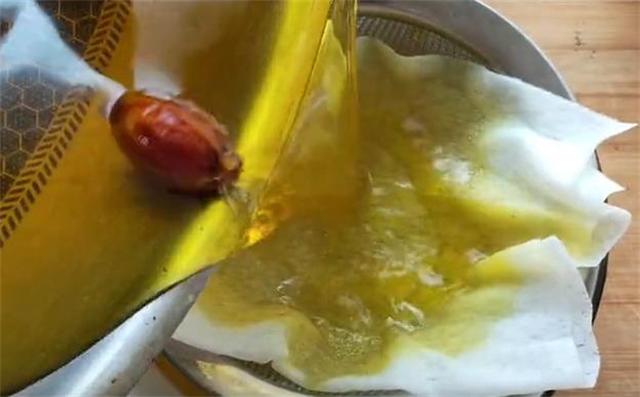 5.然后把晾凉的栀子水像这样过滤一下,去除杂质,这样腌出来的萝卜会更好看。