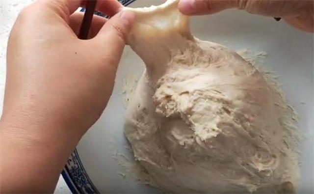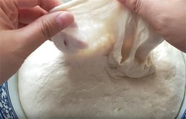3.接下来给大家看一下发好的面的状态,面筋含量越高,面团的拉丝效果越好。即使拉伸很长,面团也不会断裂。而且这个时候面的状态已经基本出膜,出膜是面包和馒头最大的一个区别,只有达到这种状态的面团,才能制作出具有拉丝效果且特别松软的面包。