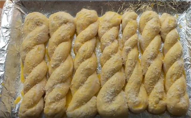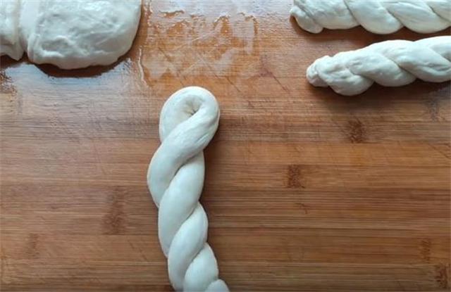 6.接着交叉卷起,生坯做好以后醒发10到30分钟左右,依据温度主要看体积变化,体积明显变大即可。