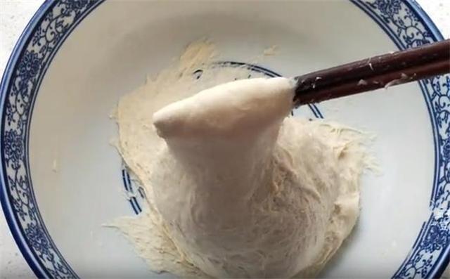 2.我们用筷子稍微挑一下,大家可以看到这个时候它已经微微出膜,此时,可在面团表面涂抹一层食用油,覆盖保鲜膜,让其醒发至体积扩大两倍。