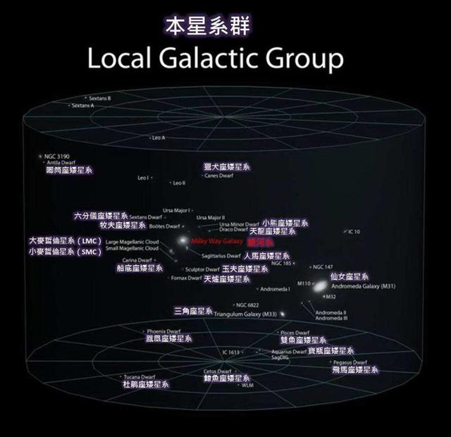 我们把视角再次拉远,看看银河系之外,会发现银河系实际上也非常渺小,银河系和仙女座大星系等十几个星系共同归属于本星系群,而这块薄饼的覆盖面积直径足有1.1亿光年。