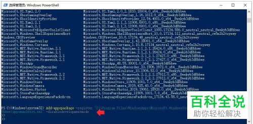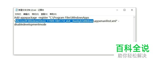 6. 第六步打开电脑记事本,根据下图所示,将蓝色区域修改为复制的版本信息,也就是【Add-appxpackage -register "C:\Program Files\WindowsApps\Microsoft.WindowsStoreXXXXX\appxmanifest.xml" -disabledevelopmentmode】。