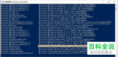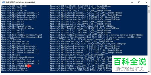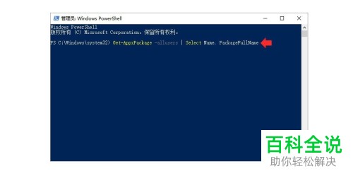3. 第三步打开【Windows PowerShell】窗口后,根据下图箭头所指,在命令行中输入【Get-AppxPackage -allusers | Select Name, PackageFullName】并按下【回车】键。