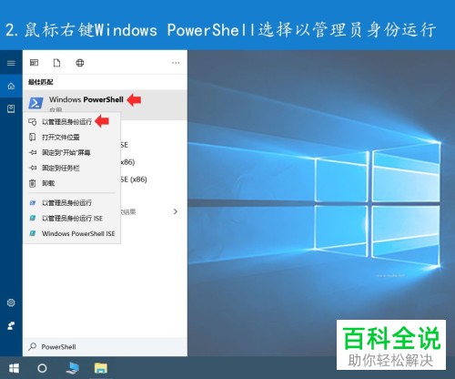 2. 第二步在搜索结果中,根据下图箭头所指,鼠标右键单击【Windows PowerShell】,接着点击【以管理员身份运行】选项。