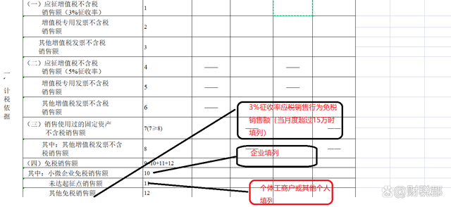 《增值税及附加税费申报表(小规模纳税人适用)》主表,纵向根据应税销售行为,分为“货物及劳务”(填列纳税人销售货物及劳务对应项目)和“服务、不动产及无形资产”(填列纳税人销售服务、不动产及无形资产对应项目);横向分为三个部分,第一部分为计税依据;第二部分为税款计算;第三部分为附加税费。主表中纳税人主要填写项目在第一部分,第二部分根据第一部分填列的计税依据以及《减免税明细表》自动填列,第三部分根据附列资料二填列数据系统自动填列。 小规模纳税人提供适用3%征收率的应税销售行为,合计月度应税销售额不超过15万元(以1个季度为纳税申报期的,季度应税销售额未超过45万元的),免征增值税的销售额直接填列第(四)部分“免税销售额”,纳税人属于企业的,销售额填列在第10栏“小微企业免税销售额”,纳税人属于个体工商户或其他个人的,填列在第11栏“未达起征点销售额”对应栏次。