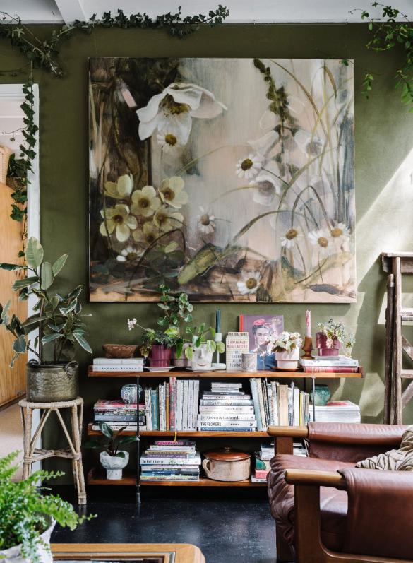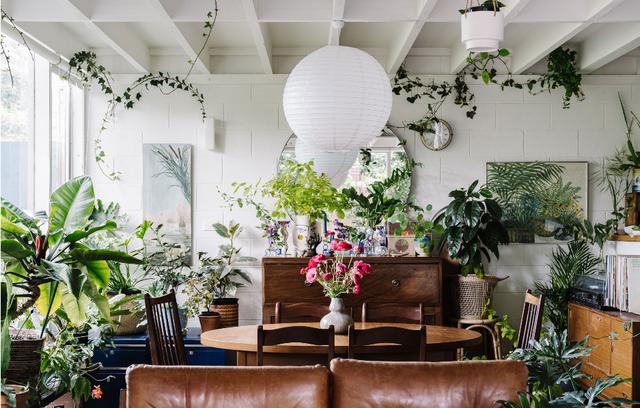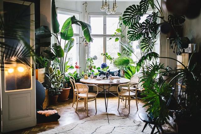 这是一个餐厅吗?好吧,看到餐桌了,确实是一个餐厅。不过,可以称为是花园式餐厅。 屋顶挂着常春藤,餐桌上摆着一盆插花,应该是在外面采回来的鲜切花。周围更是摆满了绿植,就连墙壁上,挂着的壁画都是植物的。