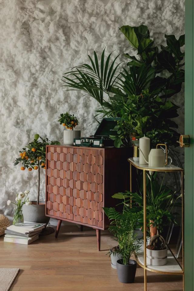 把眼光转到客厅,在客厅的一角,一个别致的橱柜,旁边是一盆金桔树,柜子也有一盆,已经到了成熟的季节,观赏、品尝也是两不误的。 橱柜的旁边,是一个简易的茶水架,养着一盆比之前小些的琴叶榕,还有一盆散尾葵,茶水架的下面还摆放着一盆人参榕。 简简单单的一个角落,瞬间变得绿意盎然起来,看的出来,主人是个注重装饰的人。