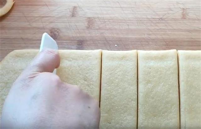 2.揉好的面不用醒面,直接将面团置于案板之上,搓成条状,然后用手把它按扁,再用擀面杖把它擀平整,厚度约0.5厘米左右,并对边缘进行适当整理,切成6到8厘米的宽条。