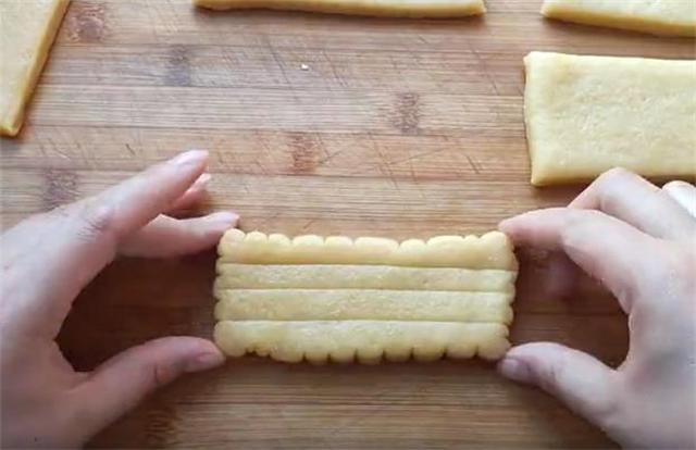 3.由于缺乏专业的模具,我们可利用刮板在饼干边缘刻画出一些装饰性的花纹,这样看起来更好看,然后醒发十分钟。