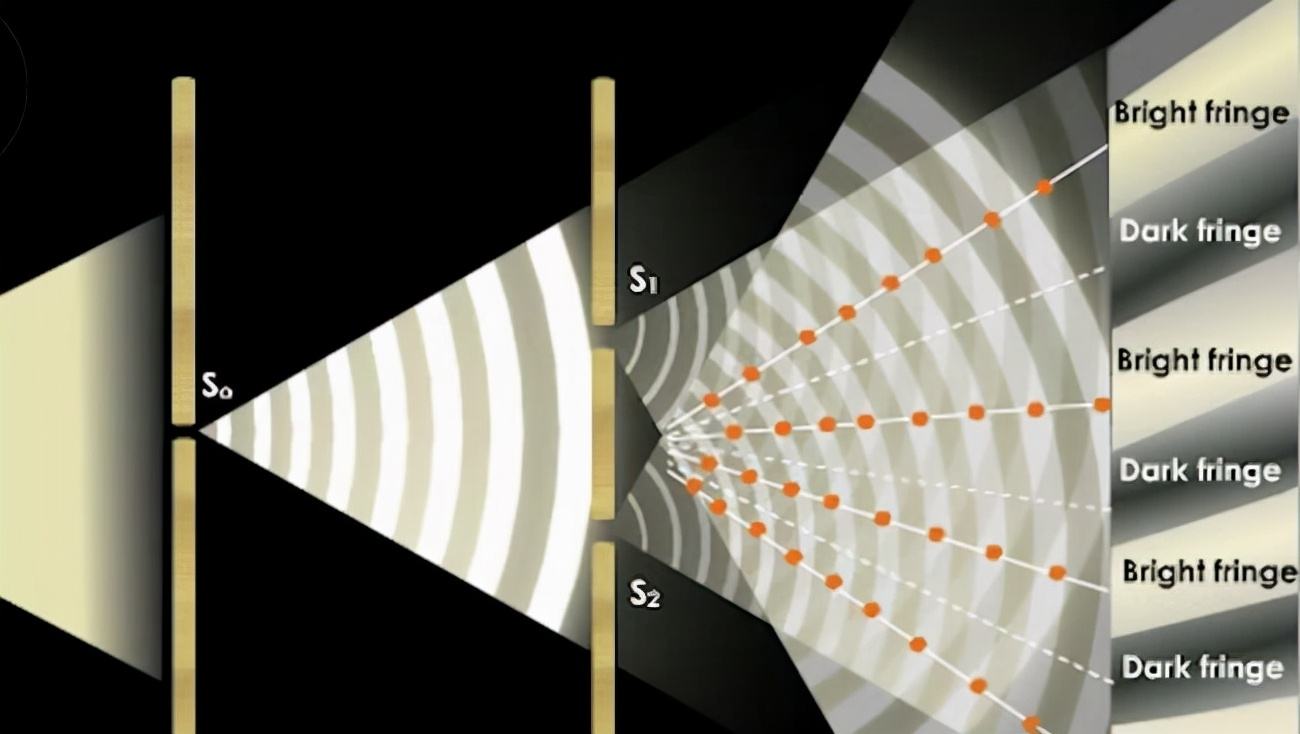 但诡异的事发生了,当科学家具体去观测光子时,光又变成了粒子,在背景板形成两条条纹,往后的实验都是如此,彷佛光子知道你在观察它,就会给你具体的路径。
