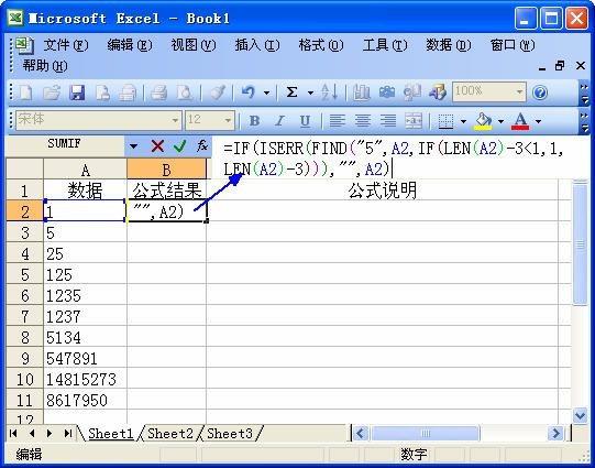 第1步 在B2单元格中输入公式"=IF(ISERR(FIND("5",A2,IF(LEN(A2)-3<1,1,LEN(A2)-3))),"",A2)",如图2所示。