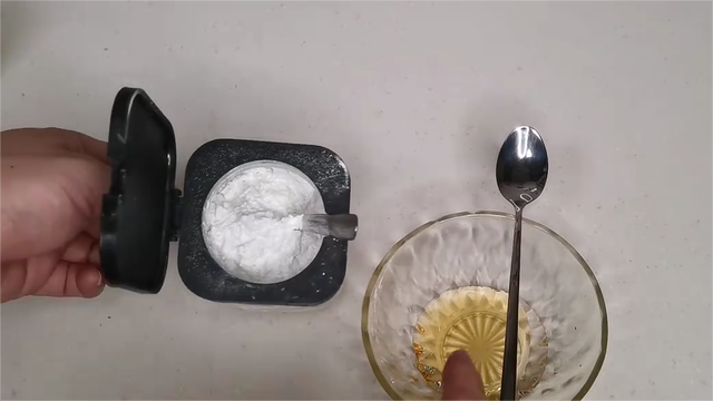 接下来,最关键的一步来了。我们需要拿出家中的生粉,大约放入两三勺。生粉可以起到吸附皮肤多余油脂的作用,也可以填充皮肤细纹,使之变得较为光滑。
