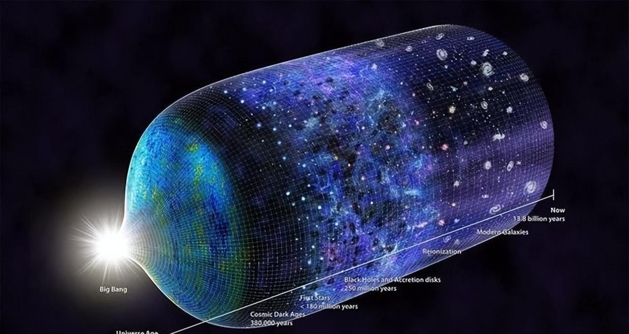 在这张仅有3角分,只占全天空一千两百万分之一的图像里,包含了上万个像银河系一样的星系,目前的可观测宇宙达到了930亿光年,但这个宇宙范围只是人类能够观察到的范围,根据宇宙大爆炸理论,宇宙目前还在加速膨胀,其边缘的膨胀速度已经到达了光速。 所以人类已知的宇宙范围很可能只是整个宇宙的冰山一角,在那之外还有更加浩瀚的空间存在。它存在边界吗? 存在着一个密度和质量无限大,温度无限高,但体积无限小的奇点。 从它爆炸的那一刻起,空间和时间诞生,物质起初以电子和光子的形式存在,待温度冷却后逐步形成原子和分子,最后演化成了我们现在看到的宇宙,这就是宇宙的开端,而在这之前,没有宇宙也没有时间和空间。