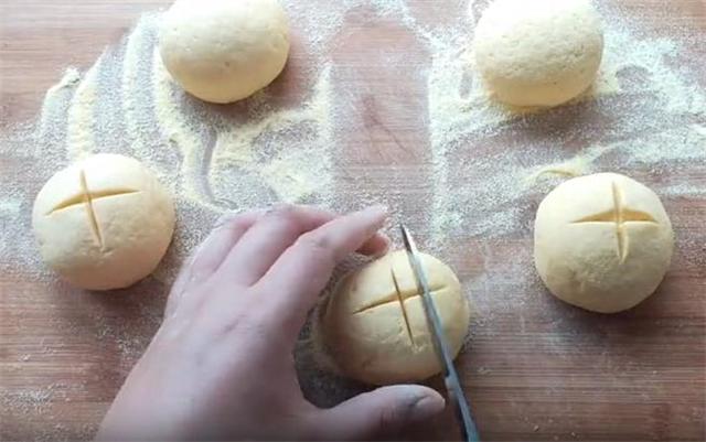 2.将发好的面团轻轻揉搓以排出气泡,然后将其揉成长条状。分割成适量的小面剂,再将其揉成馒头形状。在馒头顶部划上一个十字刀口,有利于其膨胀开花。再次醒发10到15分钟,直至体积明显增大。
