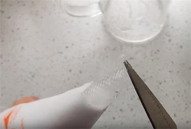 5.把调好的粉糊倒入裱花袋内,或者是干净的矿泉水瓶都可以,然后剪一个小口。