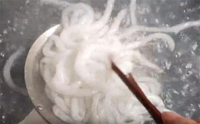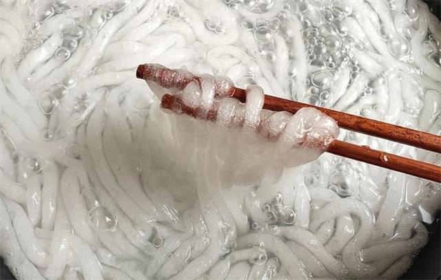 6.锅中一定多放水,水烧开以后开大火,挤入粉糊,大概煮一分多钟,煮至体积明显变大,面条飘起出锅过凉水。