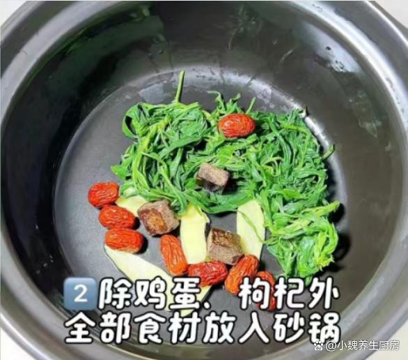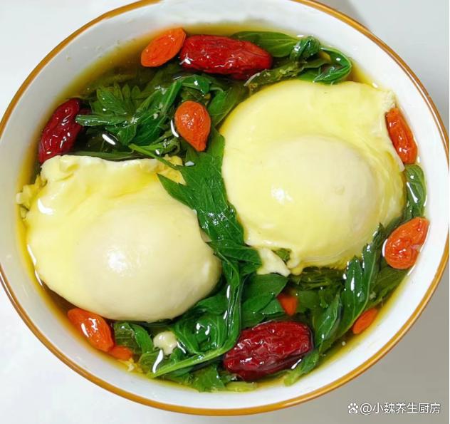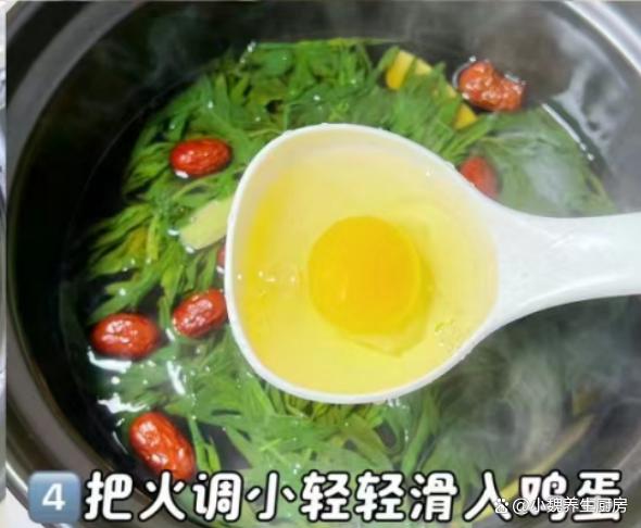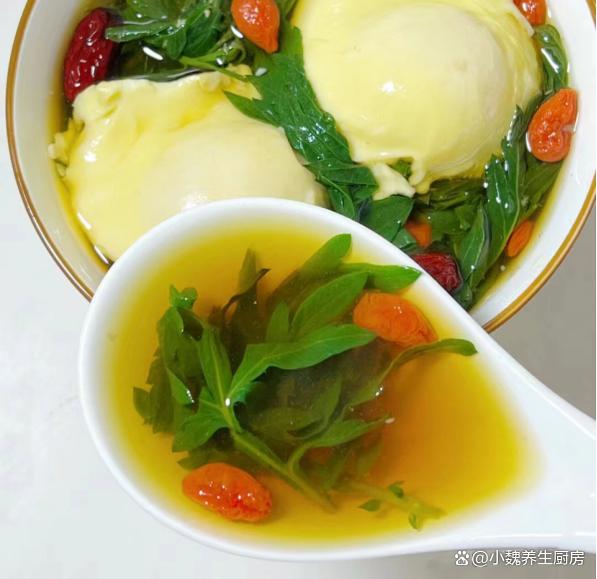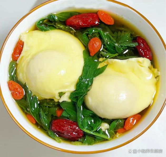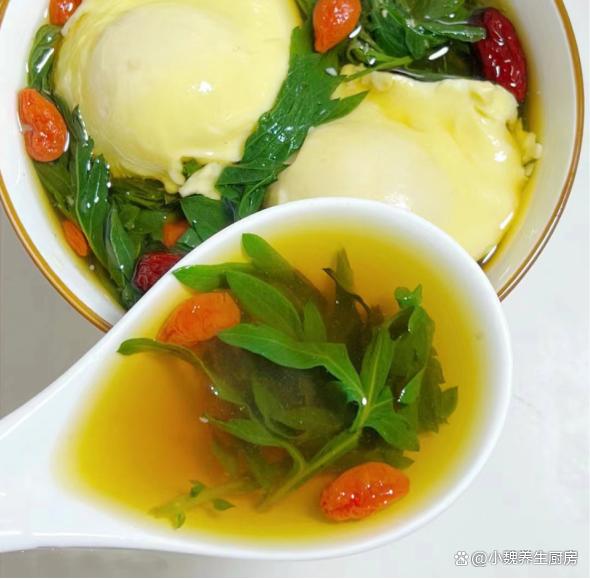 第七步:最后丢入一些枸杞子即可,这款艾草鸡蛋枸杞汤就制作完成了。 艾草鸡蛋枸杞汤的制作小贴士:1. 选材要讲究:首先,我们要选择新鲜的艾草和优质的鸡蛋。艾草应该呈现出鲜绿色,没有黄叶和虫蛀;鸡蛋则应该选择新鲜、无裂纹的。此外,枸杞也要选择粒大、饱满、无杂质的。2. 熬汤火候要控制得当:在熬汤的过程中,火候的控制至关重要。一般来说,我们应该用中小火慢慢熬煮,以保证汤品的口感和营养。避免使用大火,以免导致汤品过于浓稠或煮糊。3. 搭配要合理:除了艾草、鸡蛋和枸杞外,我们还可以根据个人喜好搭配一些其他食材,如红枣、桂圆等。这些食材不仅口感丰富,而且具有滋补作用,可以增强汤品的营养价值。4. 饮用时间要适宜:艾草鸡蛋枸杞汤适合在早餐或晚餐时饮用,可以帮助我们补充营养、提高身体免疫力。同时,在寒冷的冬季,饮用一碗热腾腾的艾草鸡蛋枸杞汤还能起到驱寒暖身的作用。 你们有没有掌握这款艾草鸡蛋枸杞汤的烹饪技巧吗?(文中的配图都出自网络)
