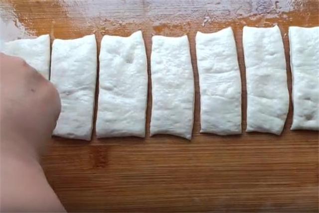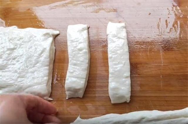 2.接下来这一步划重点,发好的面千万不要揉,按照原来的形状放在案板上,案板和手抹些油防止粘连,把它抻长按扁,稍作松弛,直至面团不再回缩,我们再把它切成小的宽条,只有在面团充分松弛后,才能确保炸制时达到理想的蓬松效果。