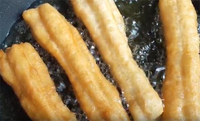 4.油温五成热,将生坯迅速下锅并翻动,以确保受热均匀,酵母的最高耐受温度为50度,因此必须保持较高的油温,以便快速升温和膨胀。若油温过低,炸出的油条将会硬而不蓬松。待油条表皮呈金黄色且焦酥时,即可出锅。
