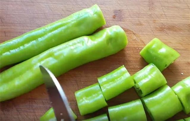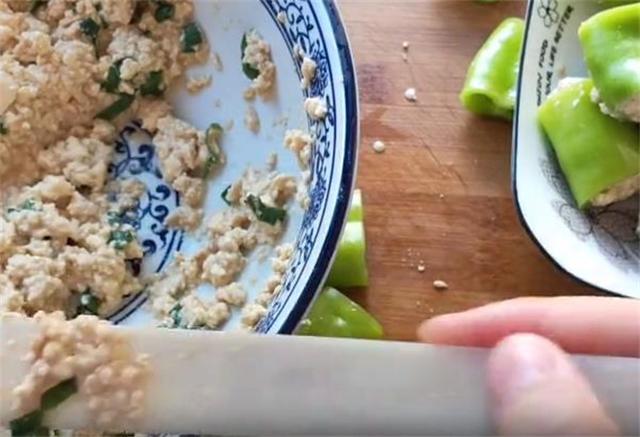 3.我们用筷子或者是勺子把捣碎的豆腐末塞入青椒段中,像这样两端抹平。
