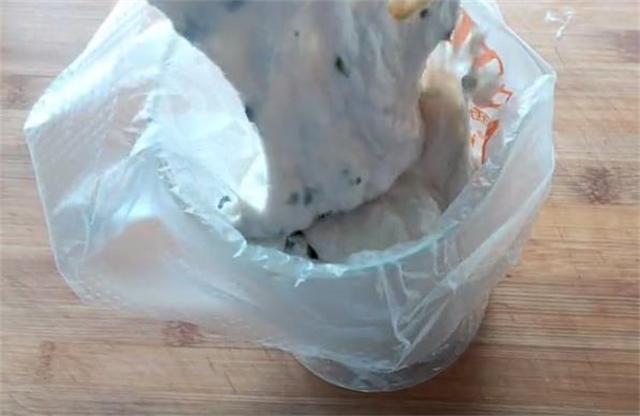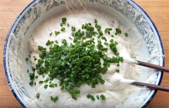 2.发好的面搅拌排气,加入适量的盐和葱花,如果过夜发酵有酸味的话,可以加一点小苏打来中和。