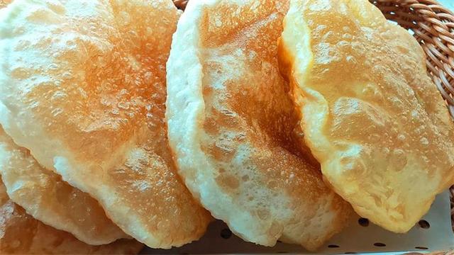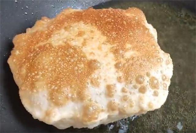 4.还需要注意的就是油温一定要高,油温6到7成热左右下锅,这样能够使表皮快速定型,才会形成一个大气,鼓起后翻面,两面金黄酥脆即可出锅,由于饼非常薄,而且油温高,大约15到20秒,一张饼就可以出锅。