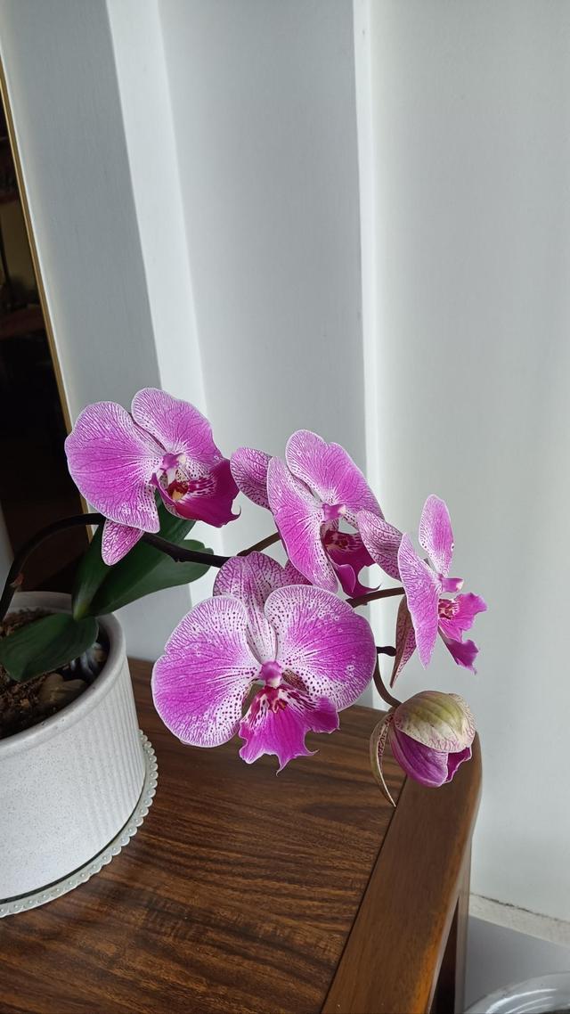 这株蝴蝶兰的花型雍容华贵,花型倩丽,绝对是蝴蝶兰中的“王者”,你瞧瞧,这株蝴蝶兰的花型,每一株兰花的茎干上,都有一个花骨朵,待到花骨朵完全成型,就像是一只栖息在枝干上的蝴蝶,即将飞舞而起,美轮美奂。 事实上,要让蝴蝶兰长成这个样子,并不是什么难事,只是,我们必须了解它的生长习性,不要象别的花花草草那样,随便浇点水、施肥,就能让它开出花来,只要多了解,多细心照料,蝴蝶兰会真正带给它一个惊喜;