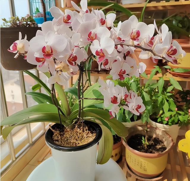1、如何养成群生状态 如果你是个初学者,那么在种植蝴蝶兰的过程中,建议用一个透明的花盆,别嫌它难看,许多有经验的花友,都会用这种花盆,这样在日常生活中,可以更直观地看到自己的根部,便于浇水和施肥; 如果你觉得花盆不够漂亮,那么在蝴蝶兰开花的时候,你可以把这几盆蝴蝶兰聚在一起,找一个冠幅较大、较漂亮的花盆,把它们集中在一处,就算是最常见的品种,也能让蝴蝶兰成为一群生长; 很多花友都很羡慕别人家的蝴蝶兰能够成群生长,但是他们并不知道,这其中有一个很大的秘密,那就是将几盆蝴蝶兰堆积在一处所产生的视觉效果。